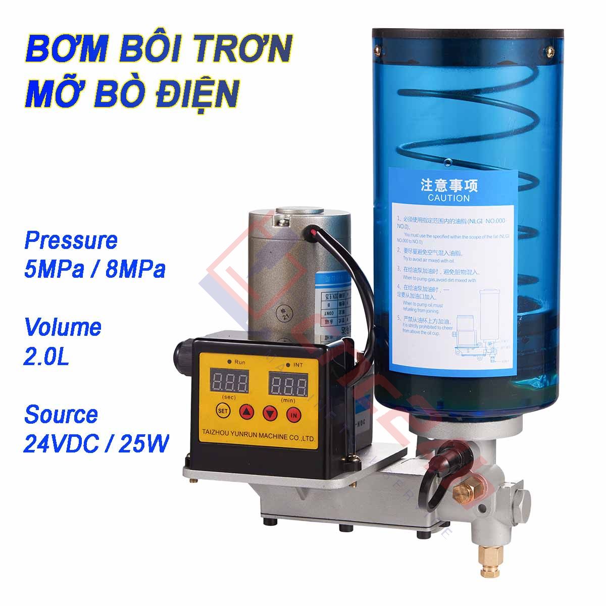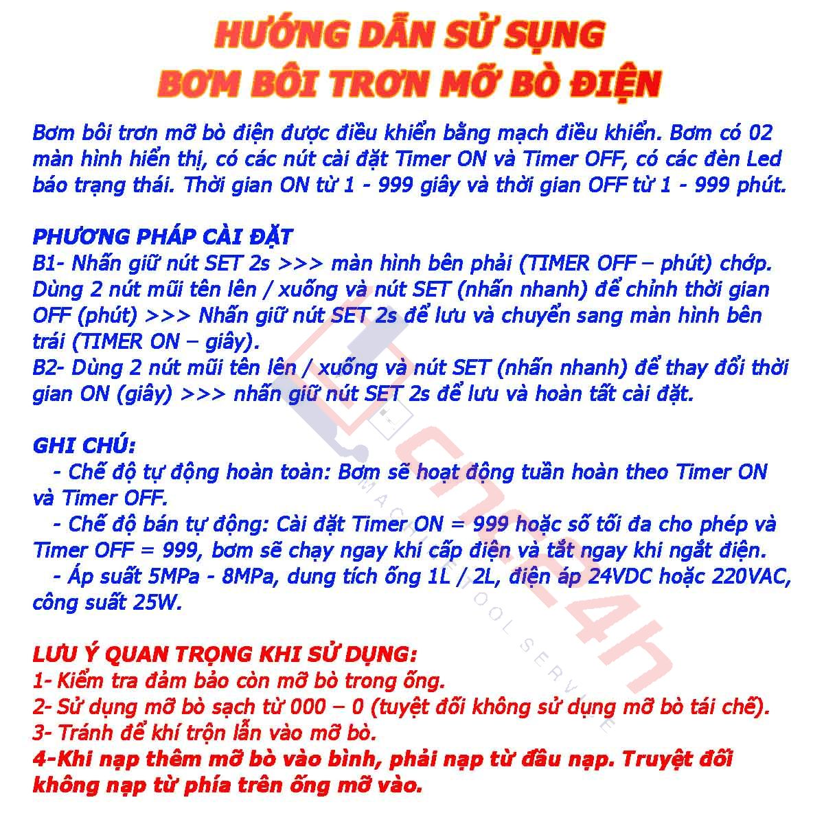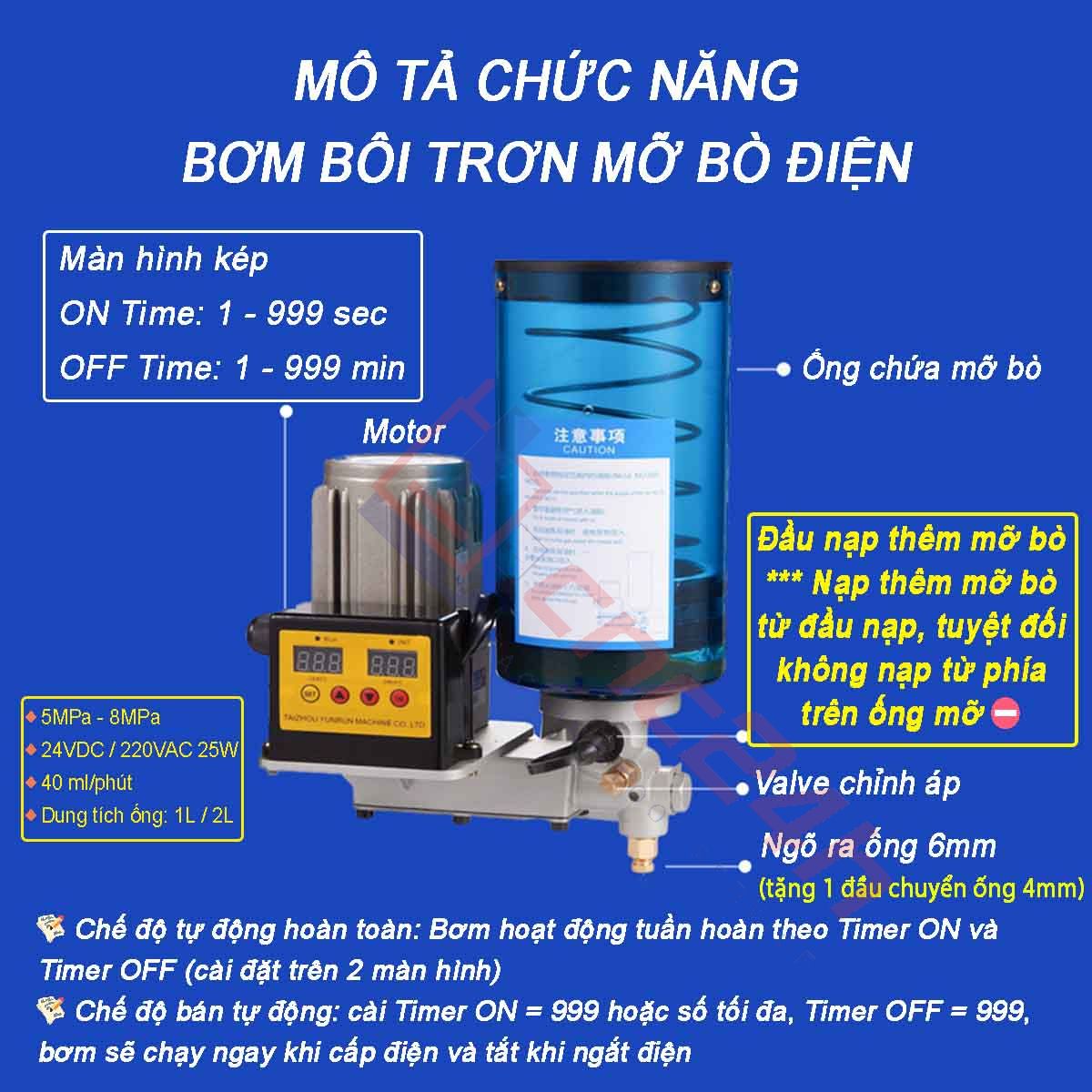 Bơm bôi trơn mỡ bò điện được điều khiển bằng mạch điều khiển. Bơm có 02 màn hình hiển thị, có các nút cài đặt Timer ON và Timer OFF, có các đèn Led báo trạng thái. Thời gian ON từ 1 đến 999 giây và thời gian OFF từ 1 đến 999 phút.